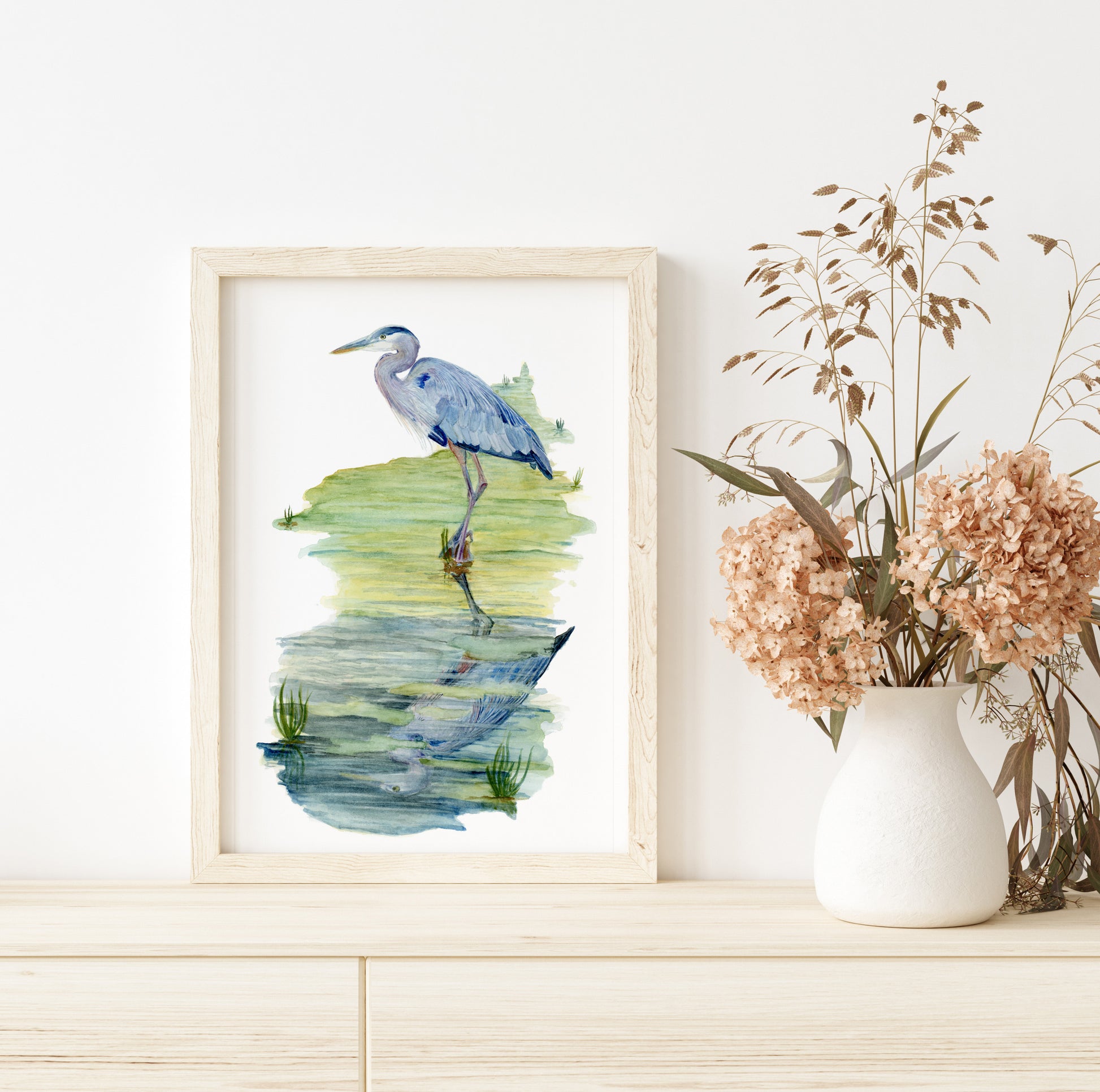 This vibrant watercolor painting by artist Lora Cavallin captures the beauty of a great blue heron and it reflection in the water. This high-quality print is the perfect way to add a touch of nature to any room.