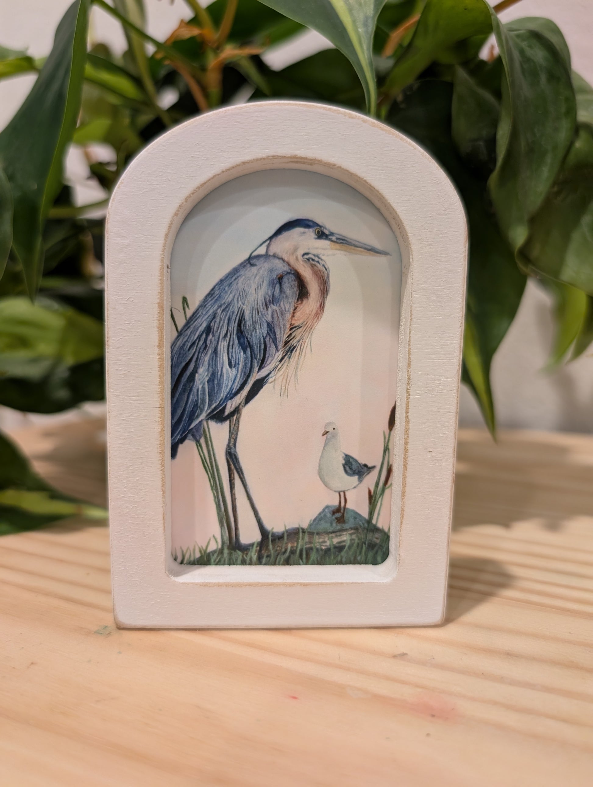 Mini Blue Heron with Seagull Art Print - Wood Arch Frame - Lora Cavallin Art