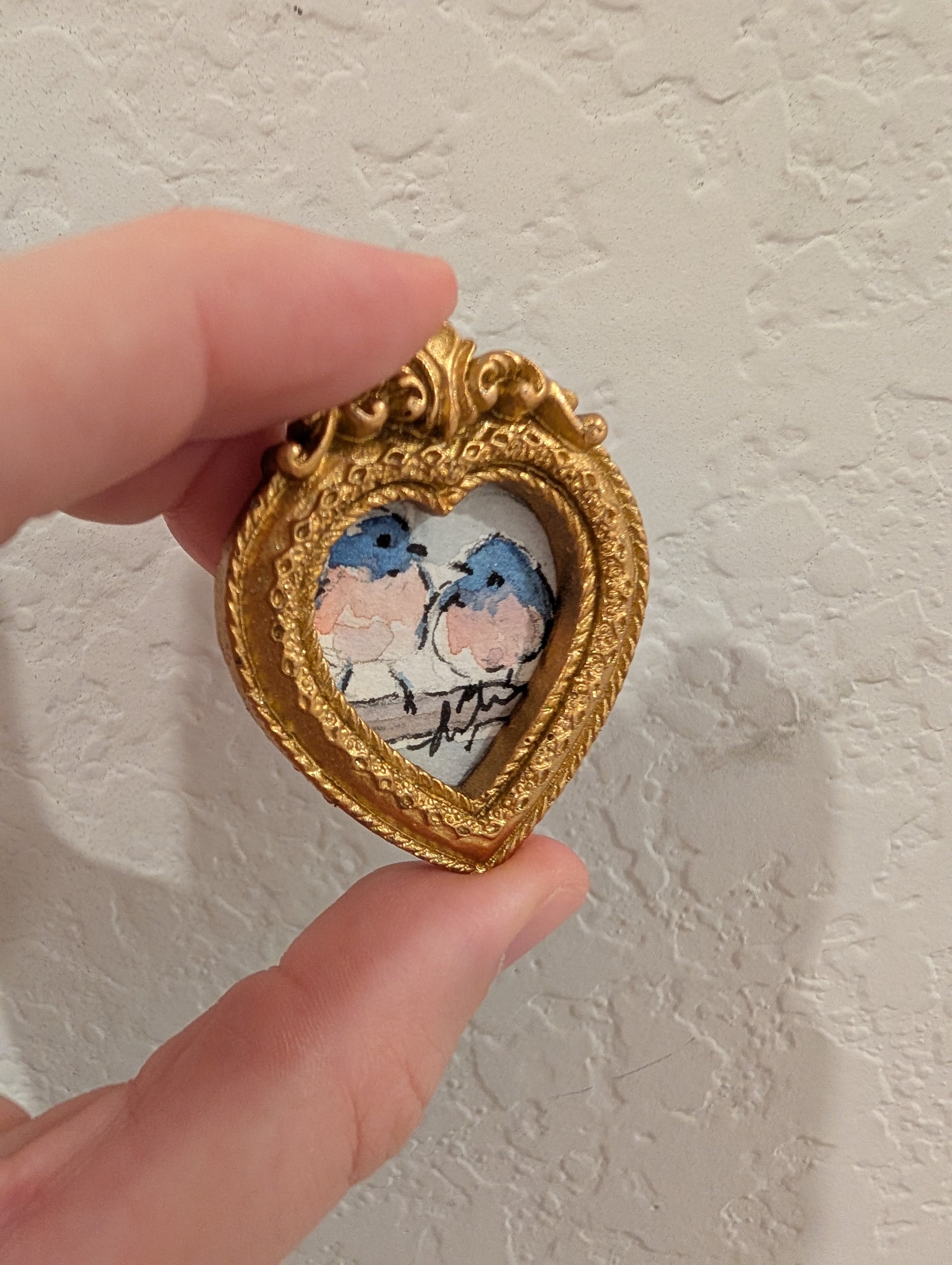 These make great gifts for any miniature enthusiast! It comes in the little gold frame, and has a tag hanger on the back.