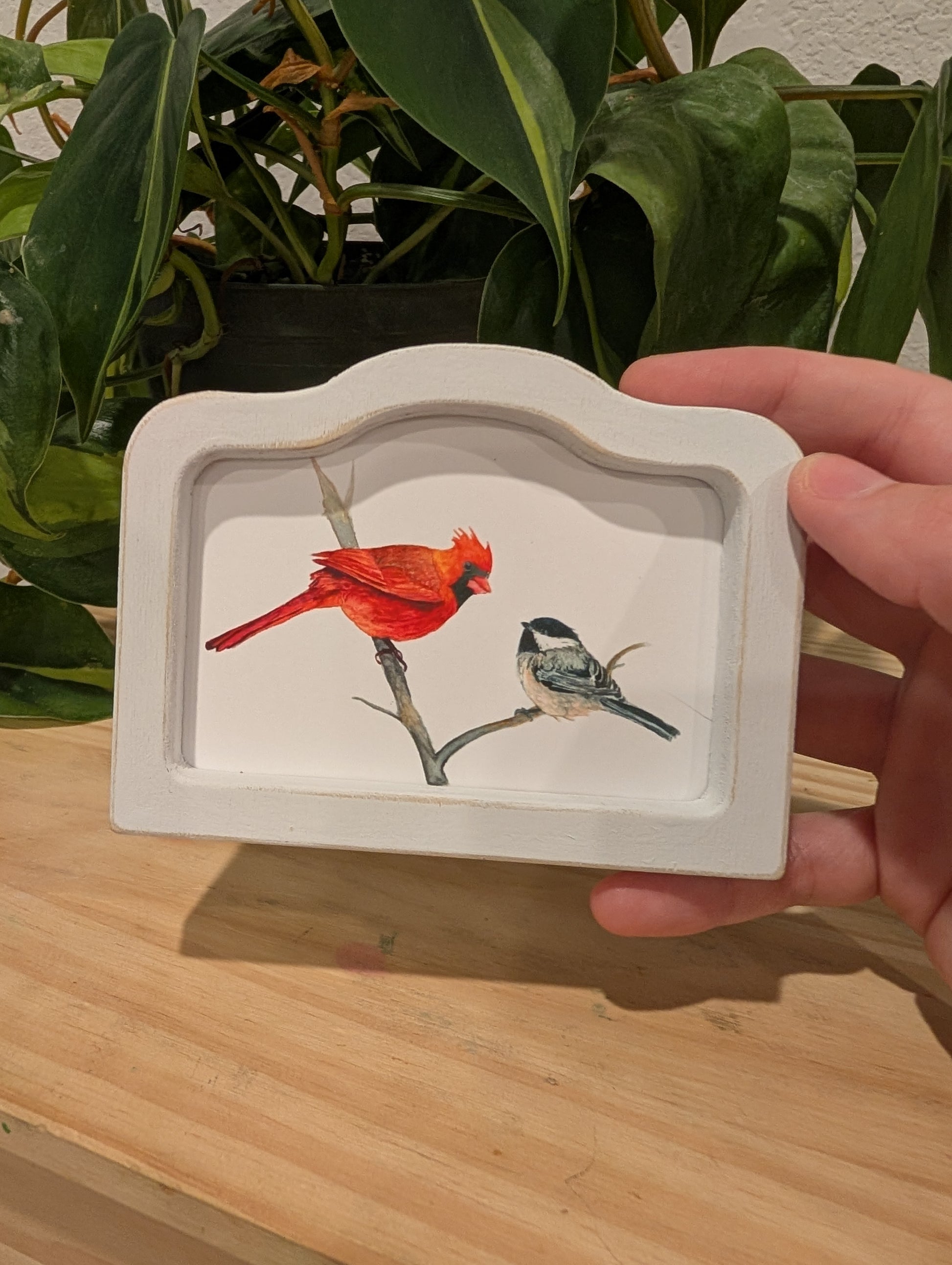 Mini Cardinal Bird and Chickadee Bird Art Print - Wood Arch Frame - Lora Cavallin Art