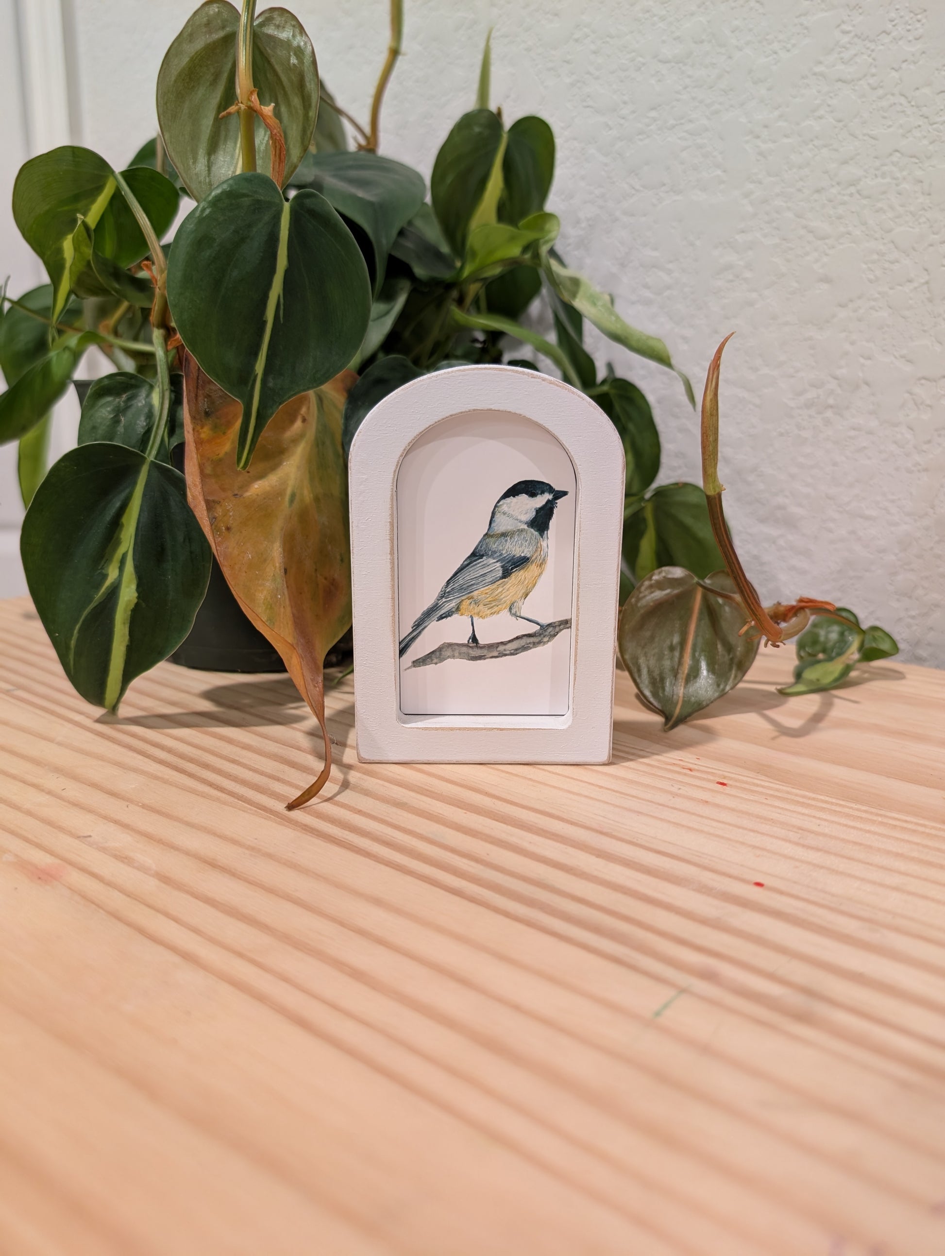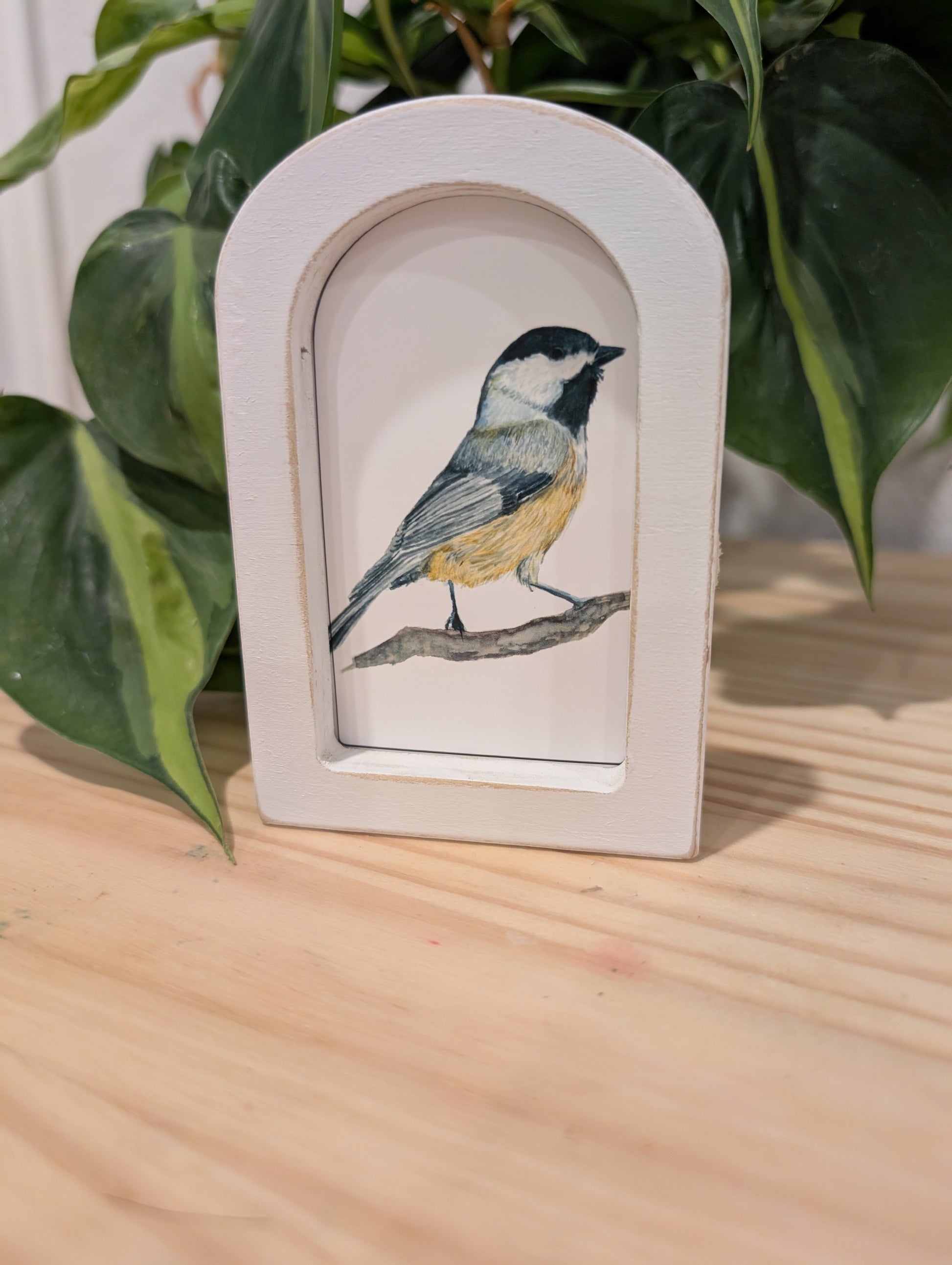 Mini Chickadee Bird Art Print - Wood Arch Frame - Lora Cavallin Art