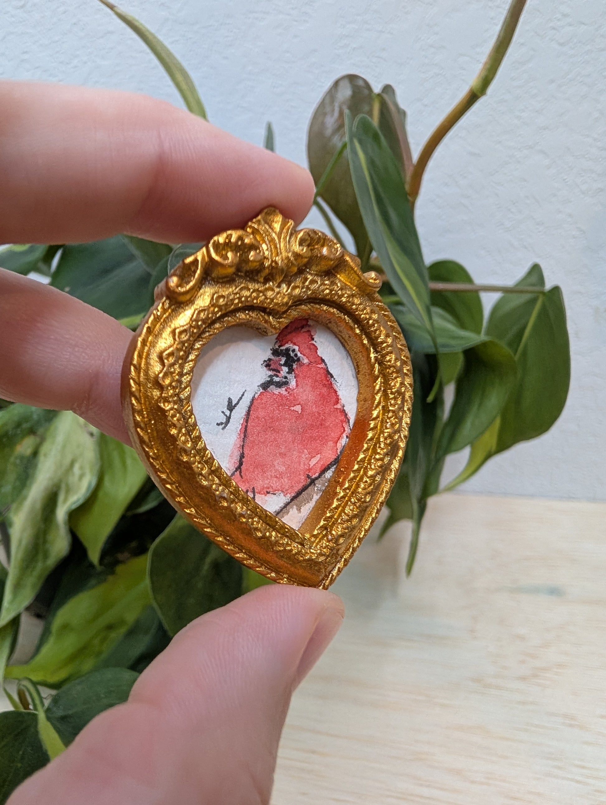 These make great gifts for any miniature enthusiast! It comes in the little gold frame, and has a tag hanger on the back.