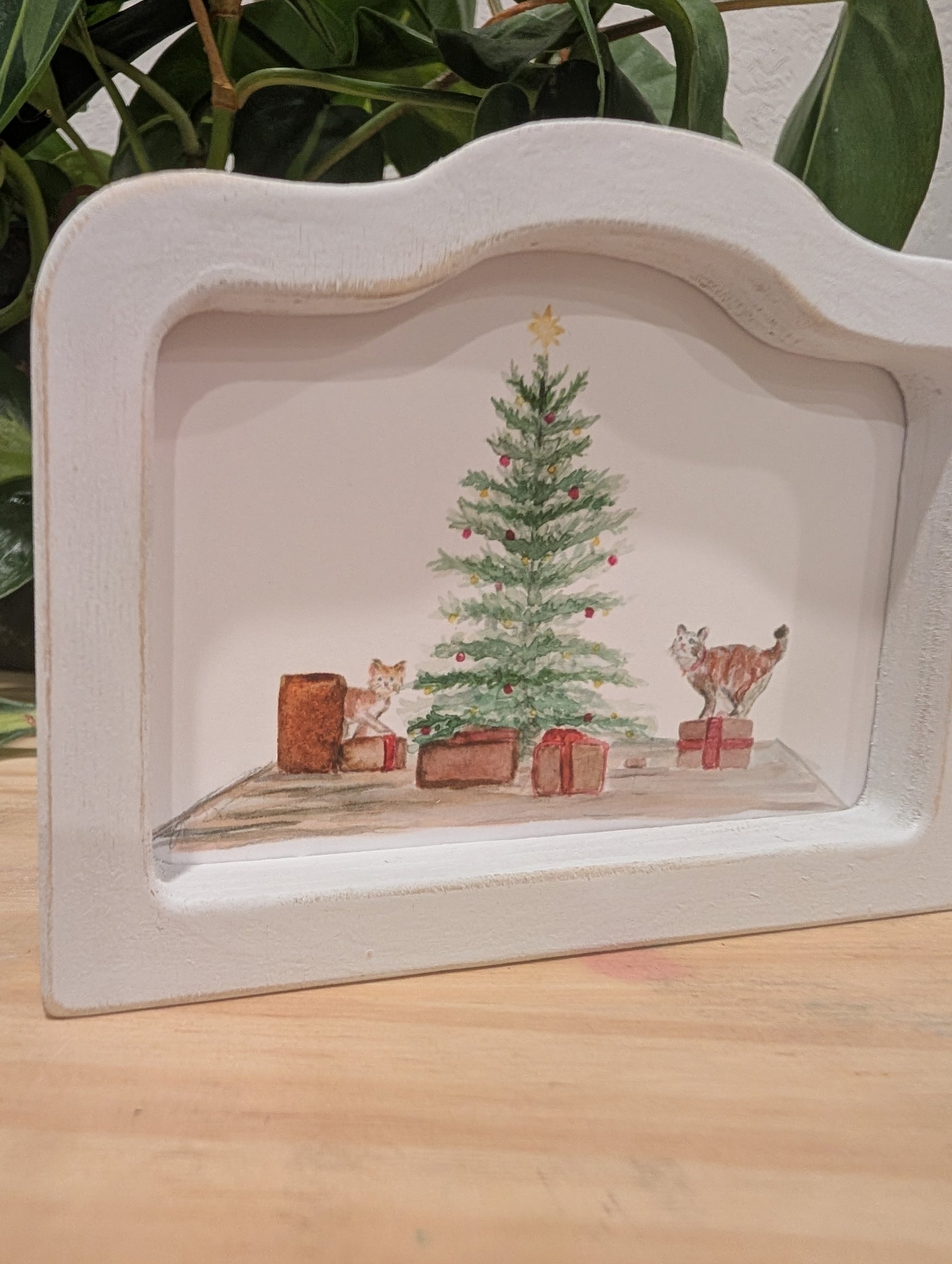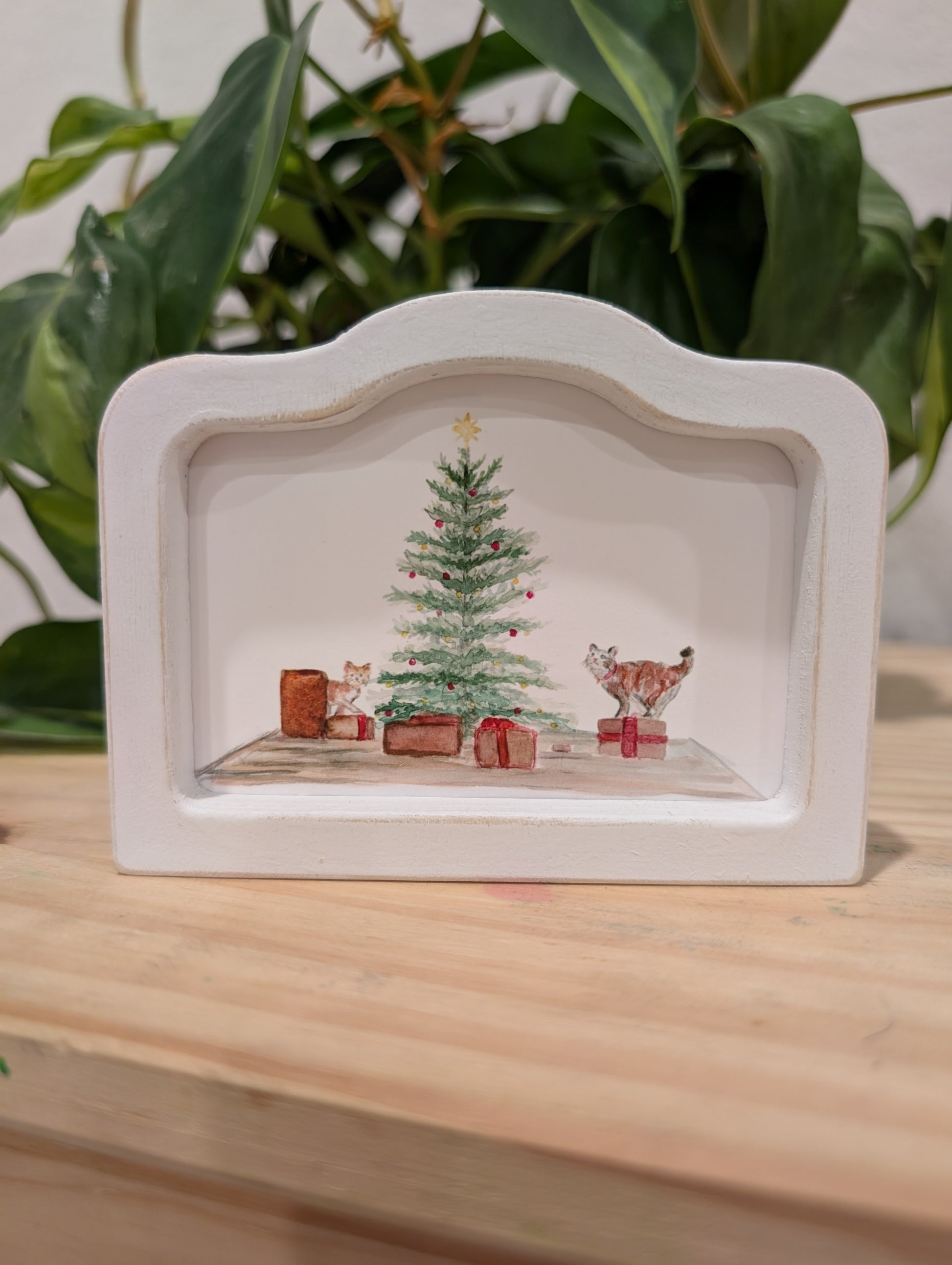 Mini Christmas Scene Cats and Presents Art Print - Wood Arch Frame - Lora Cavallin Art