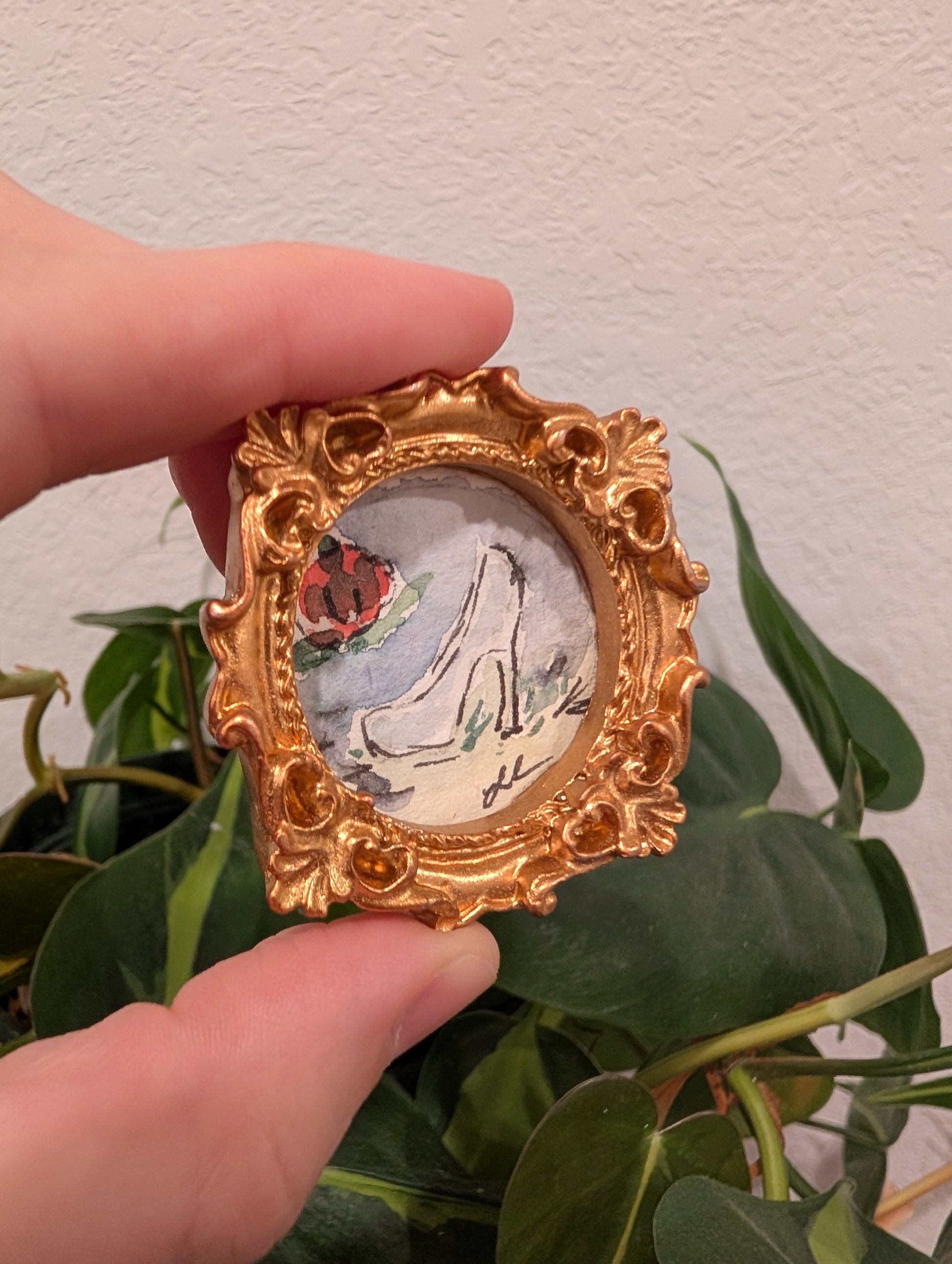 These make great gifts for any miniature enthusiast! It comes in the little gold frame, and has a tag hanger on the back.