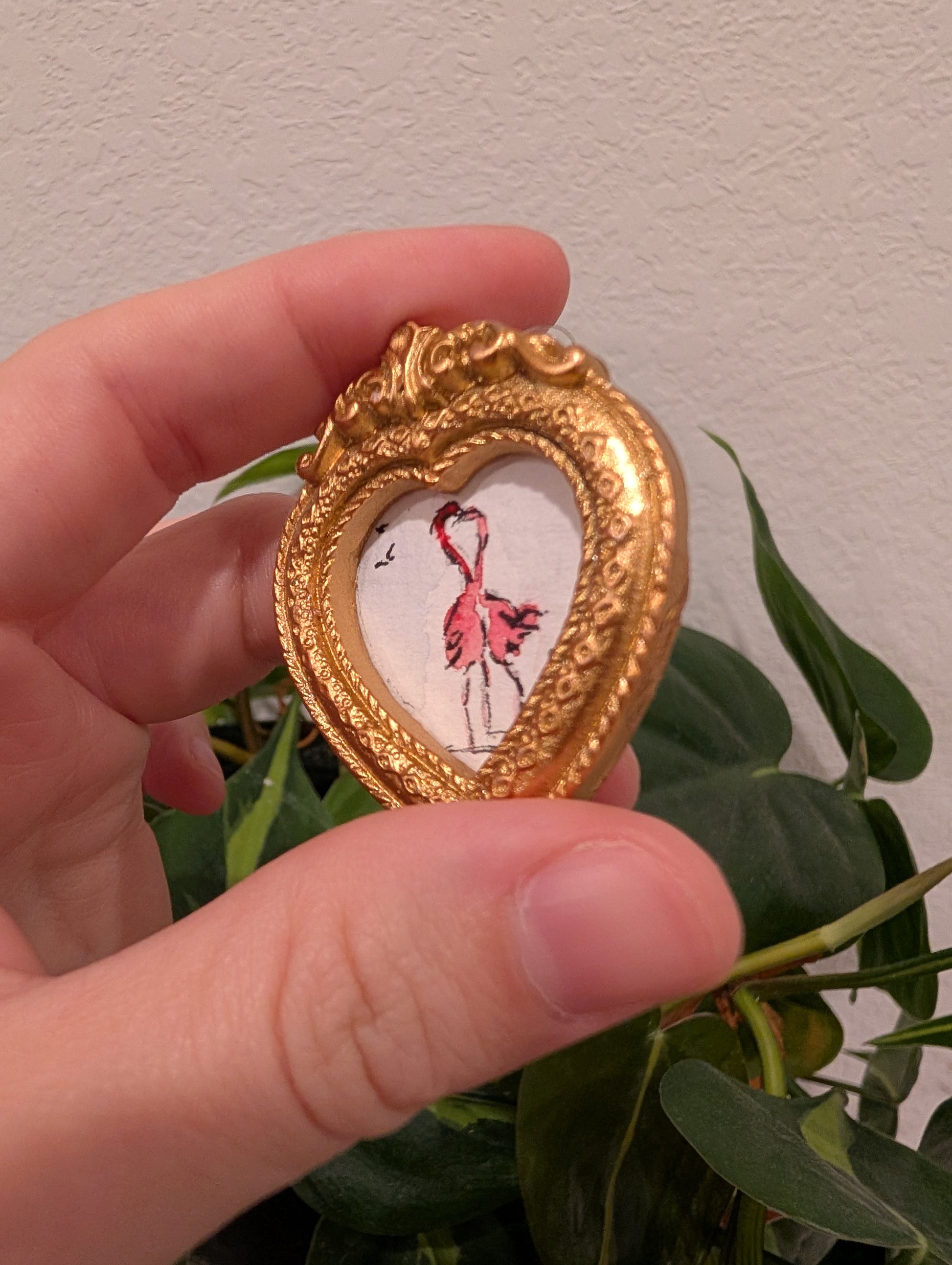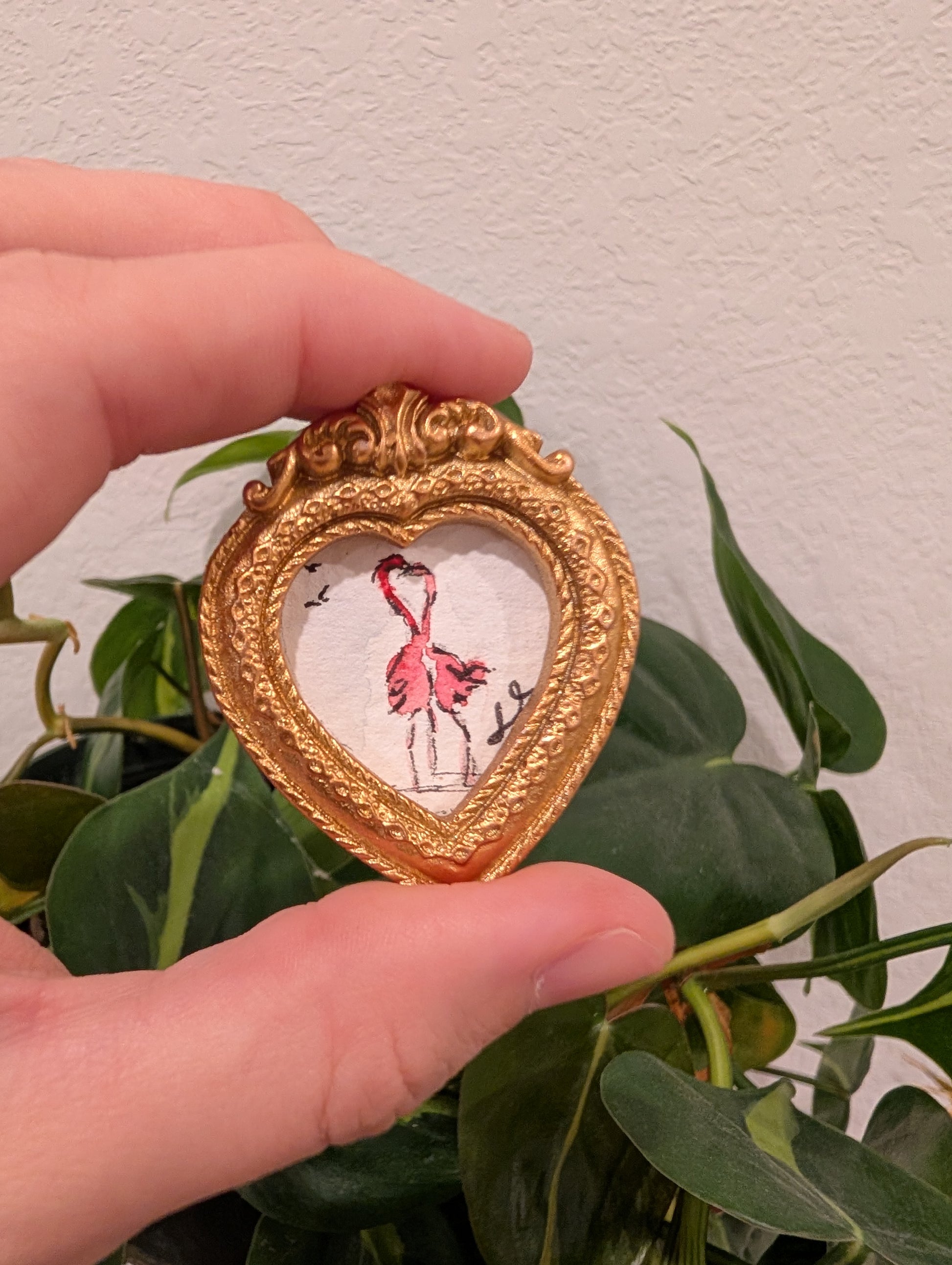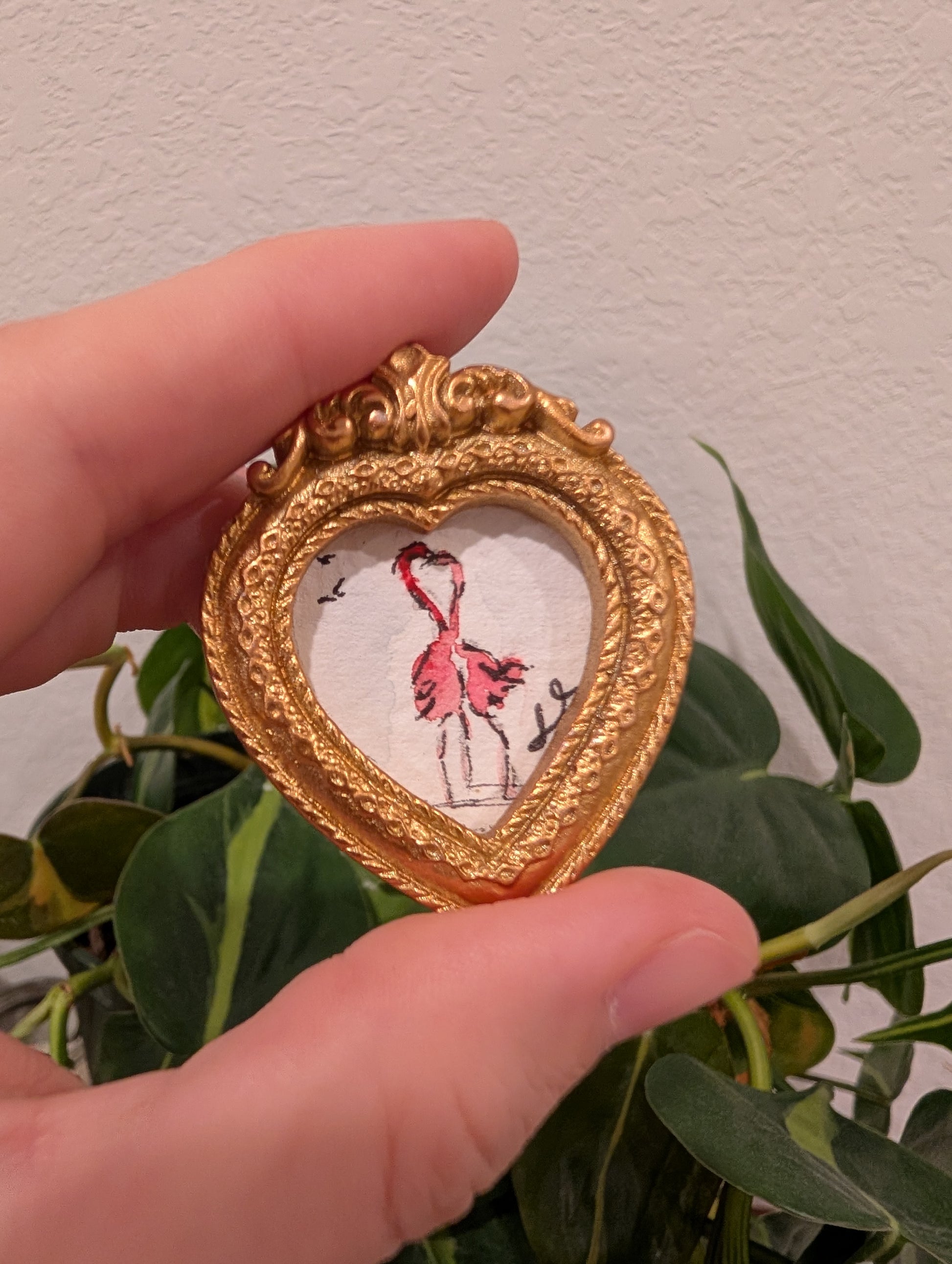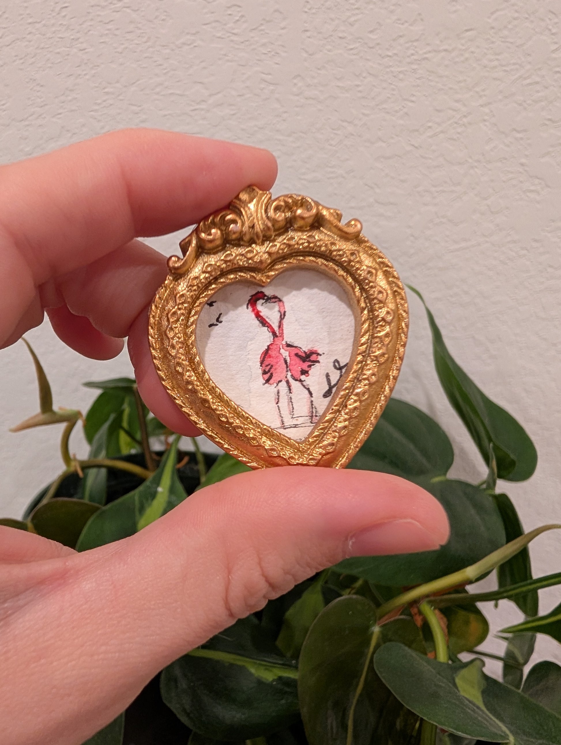 These make great gifts for any miniature enthusiast! It comes in the little gold frame, and has a tag hanger on the back.