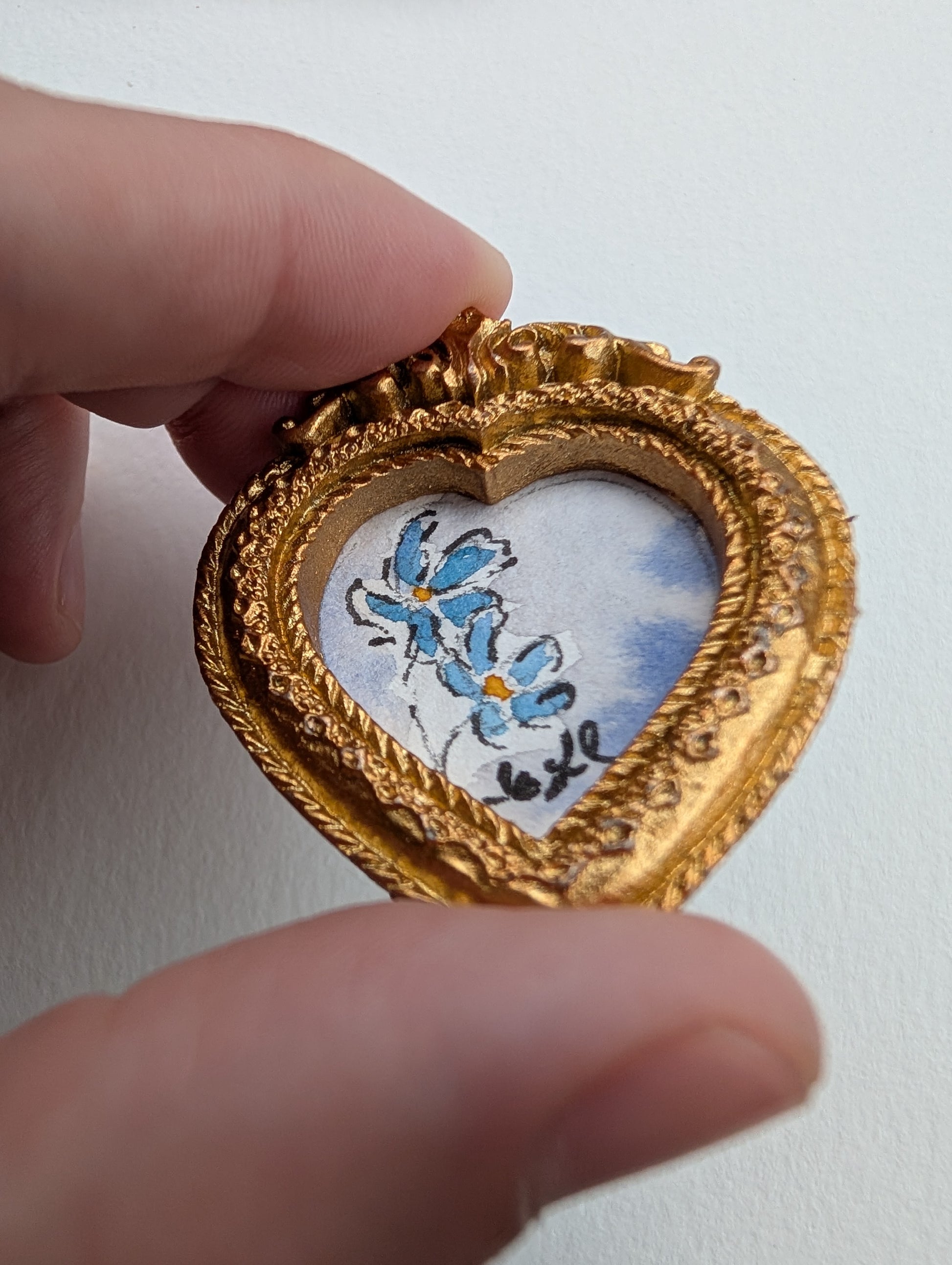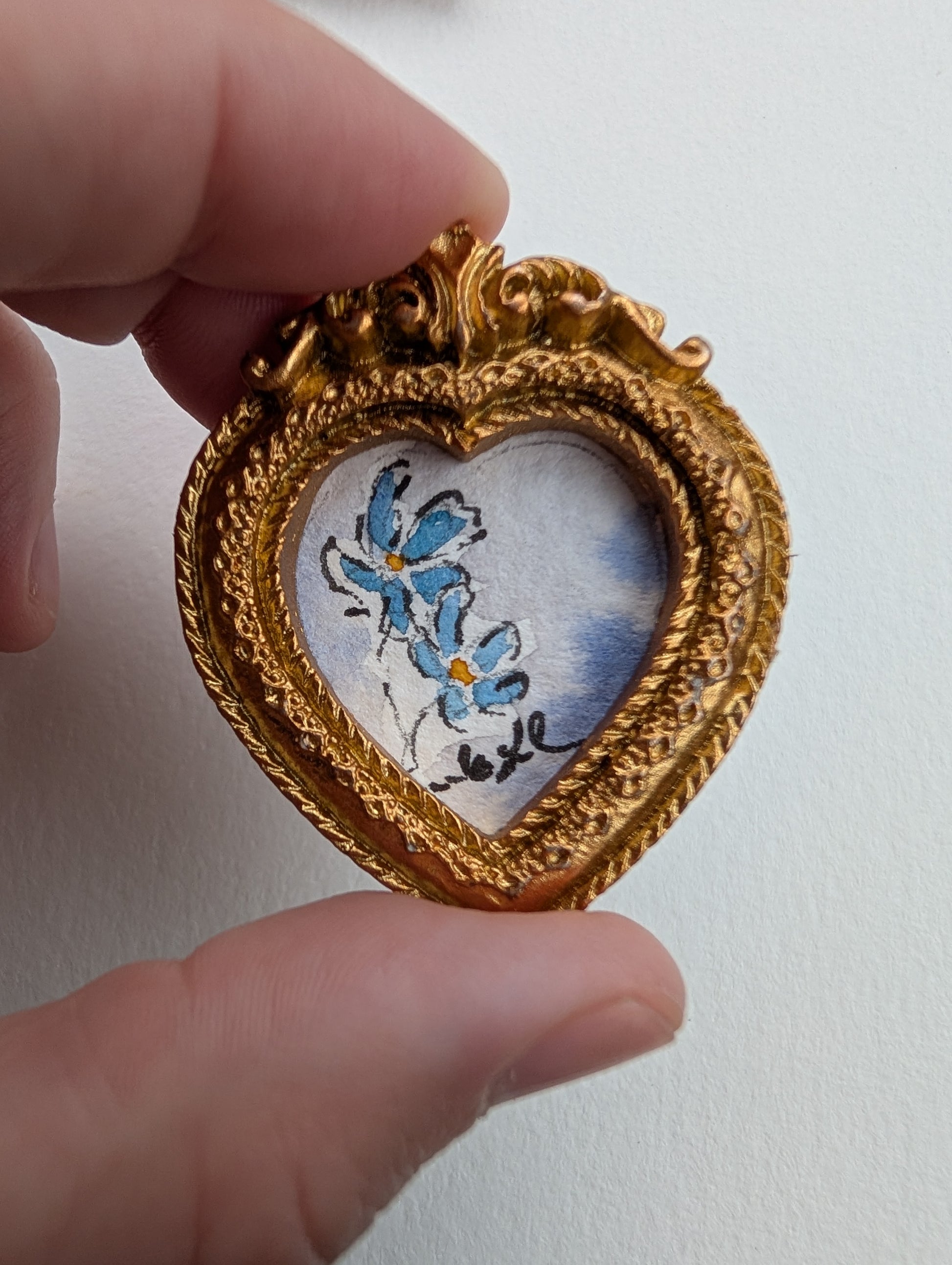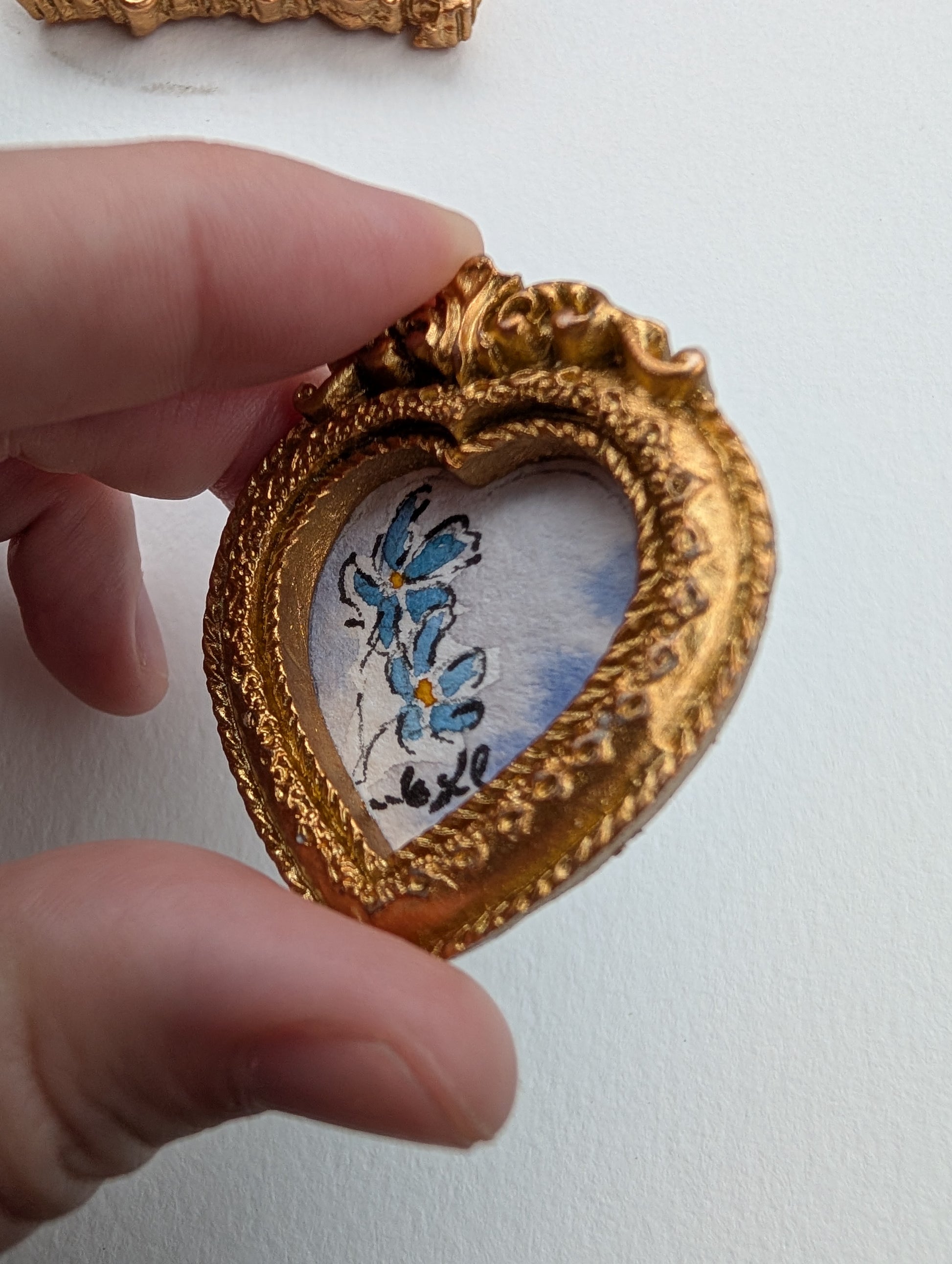 These make great gifts for any miniature enthusiast! It comes in the little gold frame, and has a tag hanger on the back.