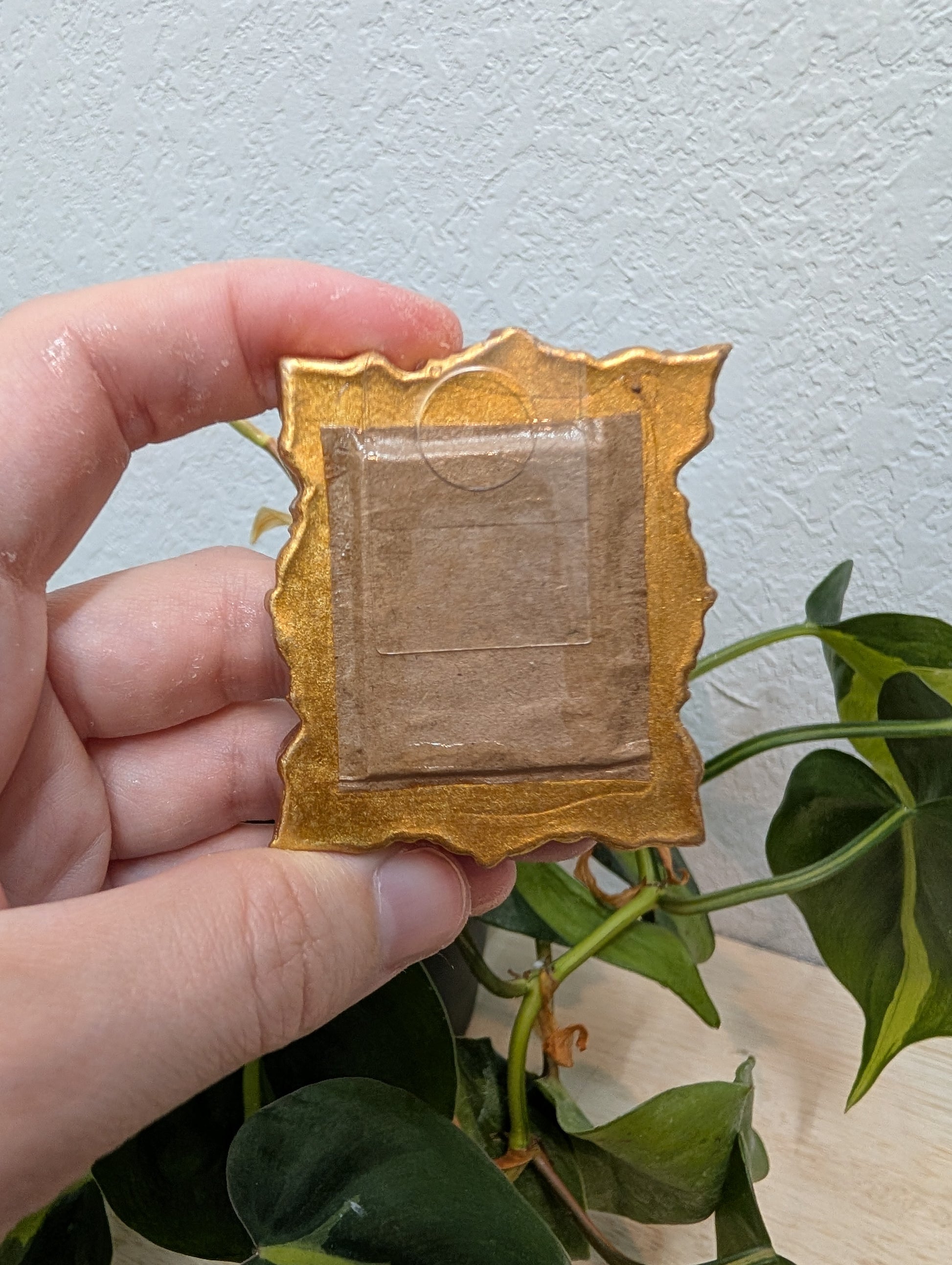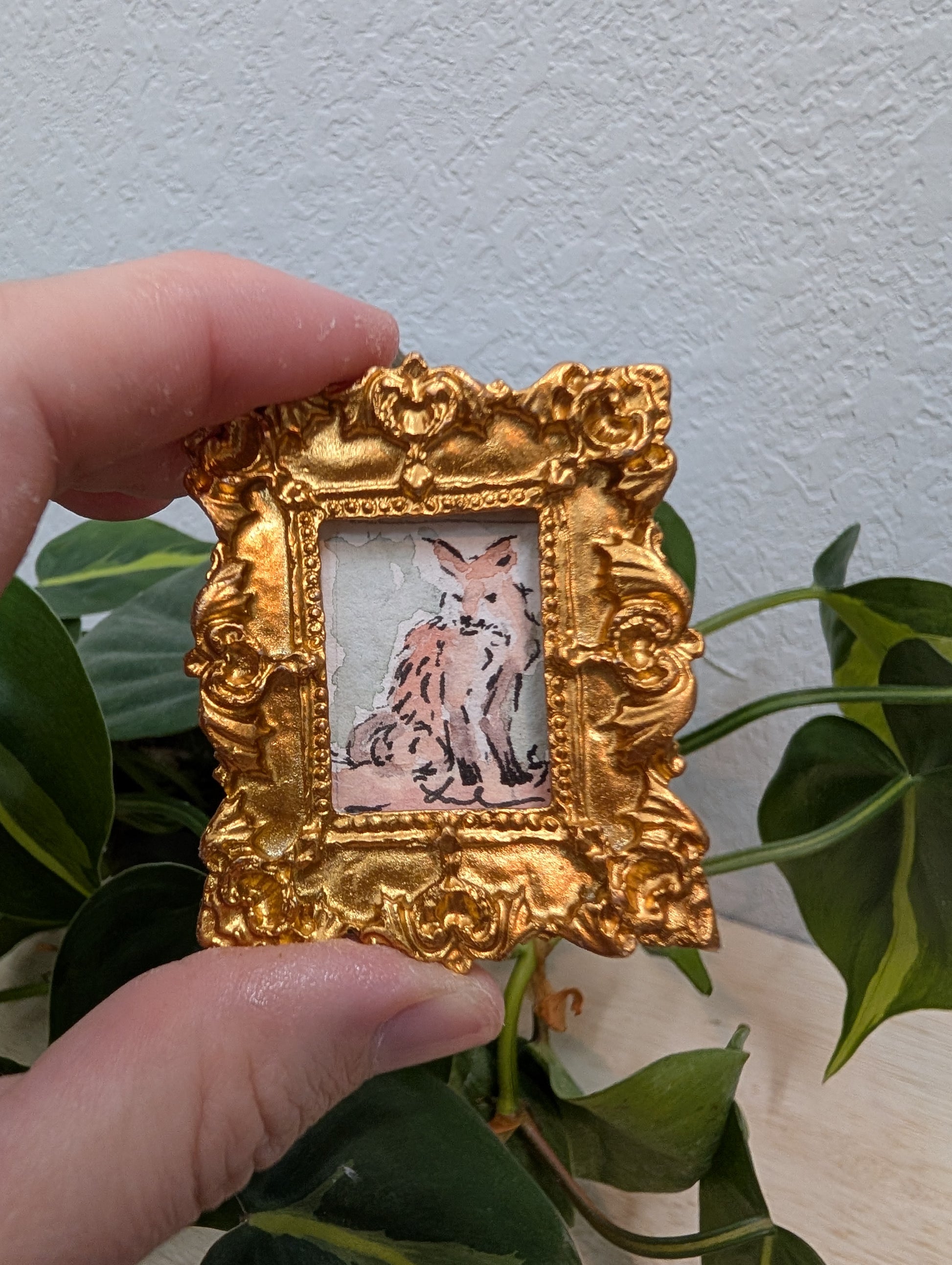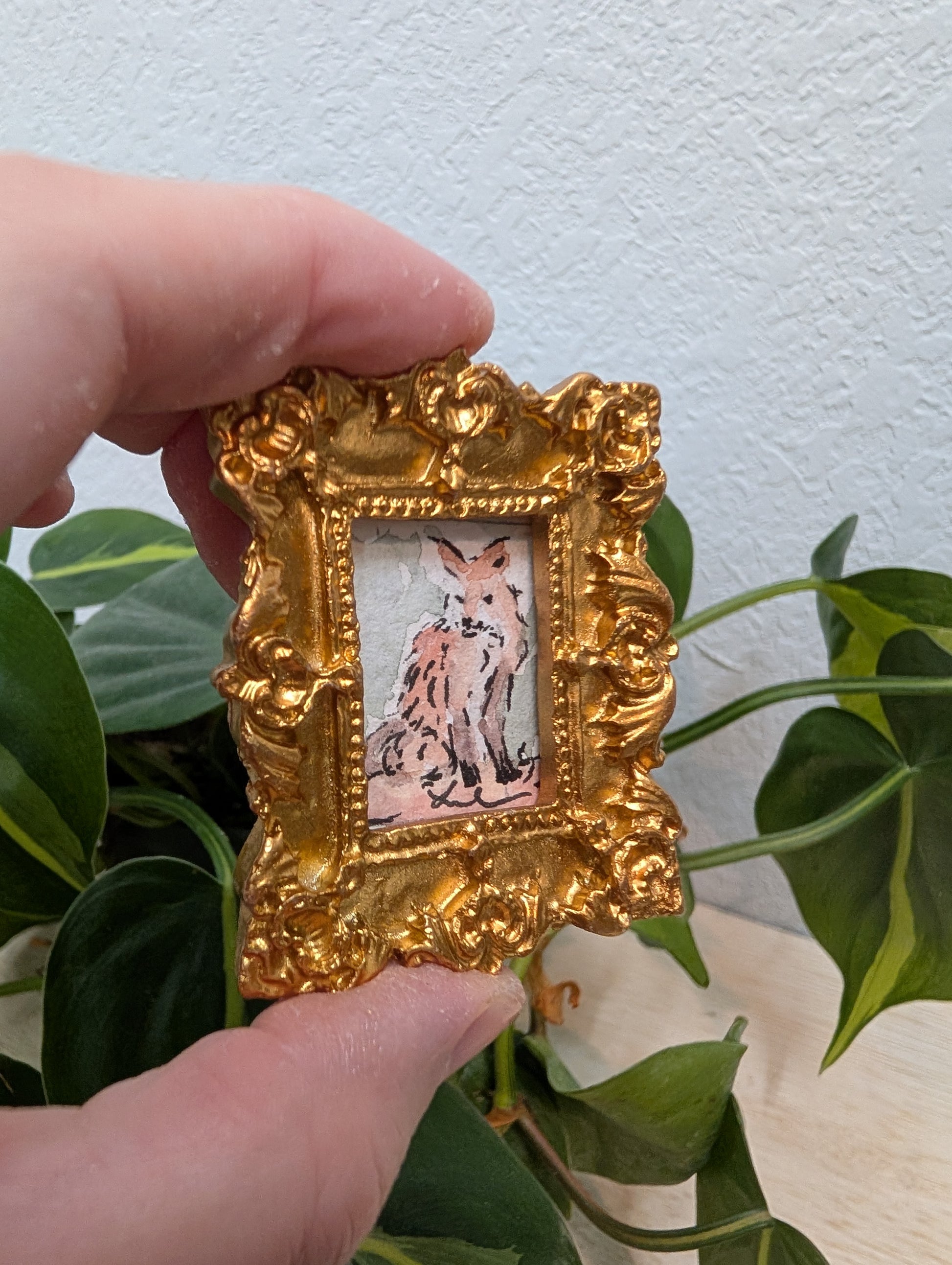 These make great gifts for any miniature enthusiast! It comes in the little gold frame, and has a tag hanger on the back.