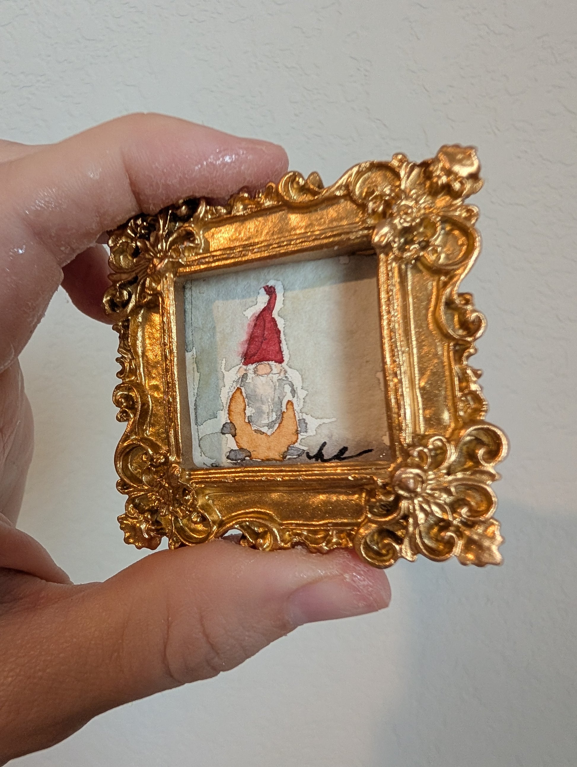 These make great gifts for any miniature enthusiast! It comes in the little gold frame, and has a tag hanger on the back.