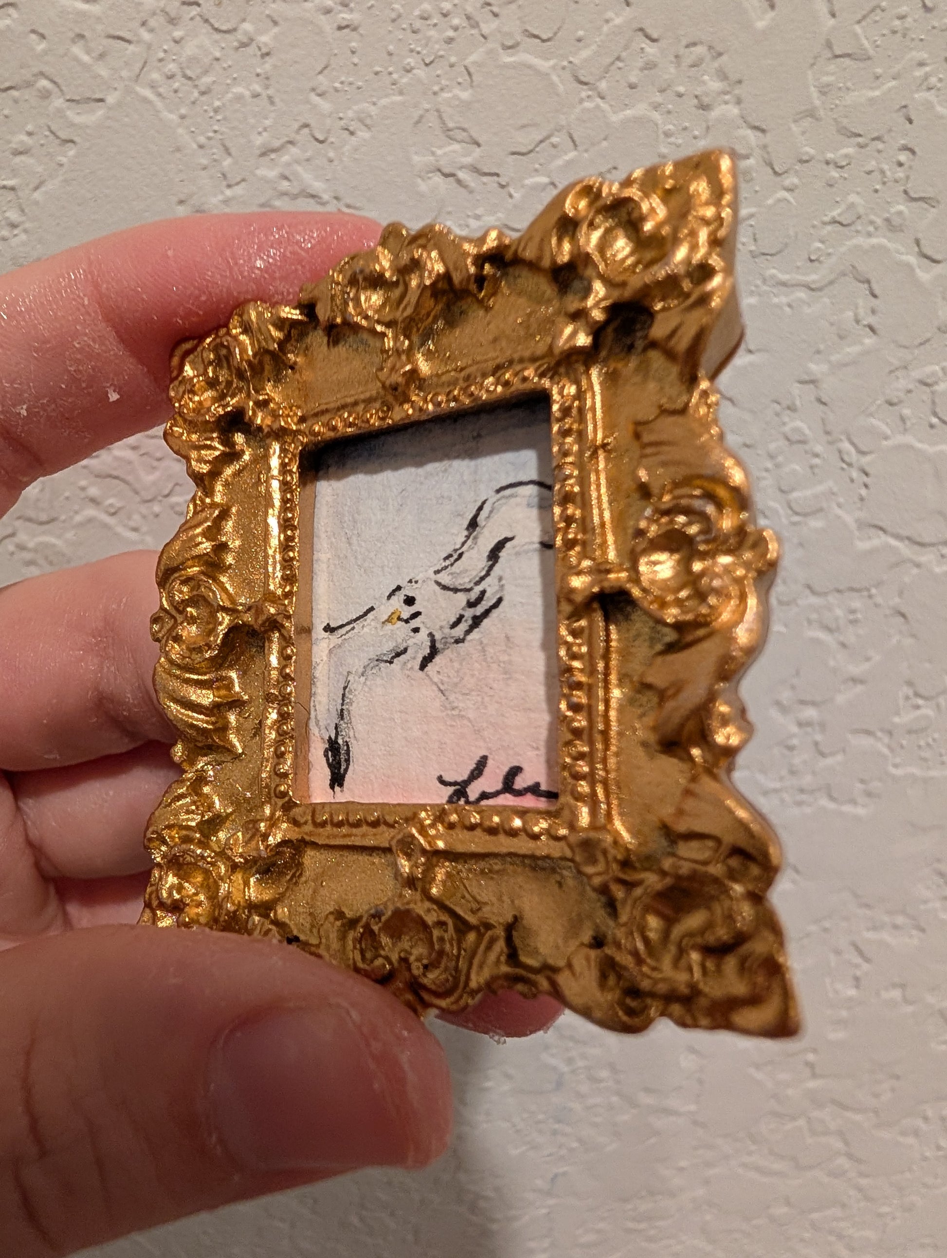 These make great gifts for any miniature enthusiast! It comes in the little gold frame, and has a tag hanger on the back.