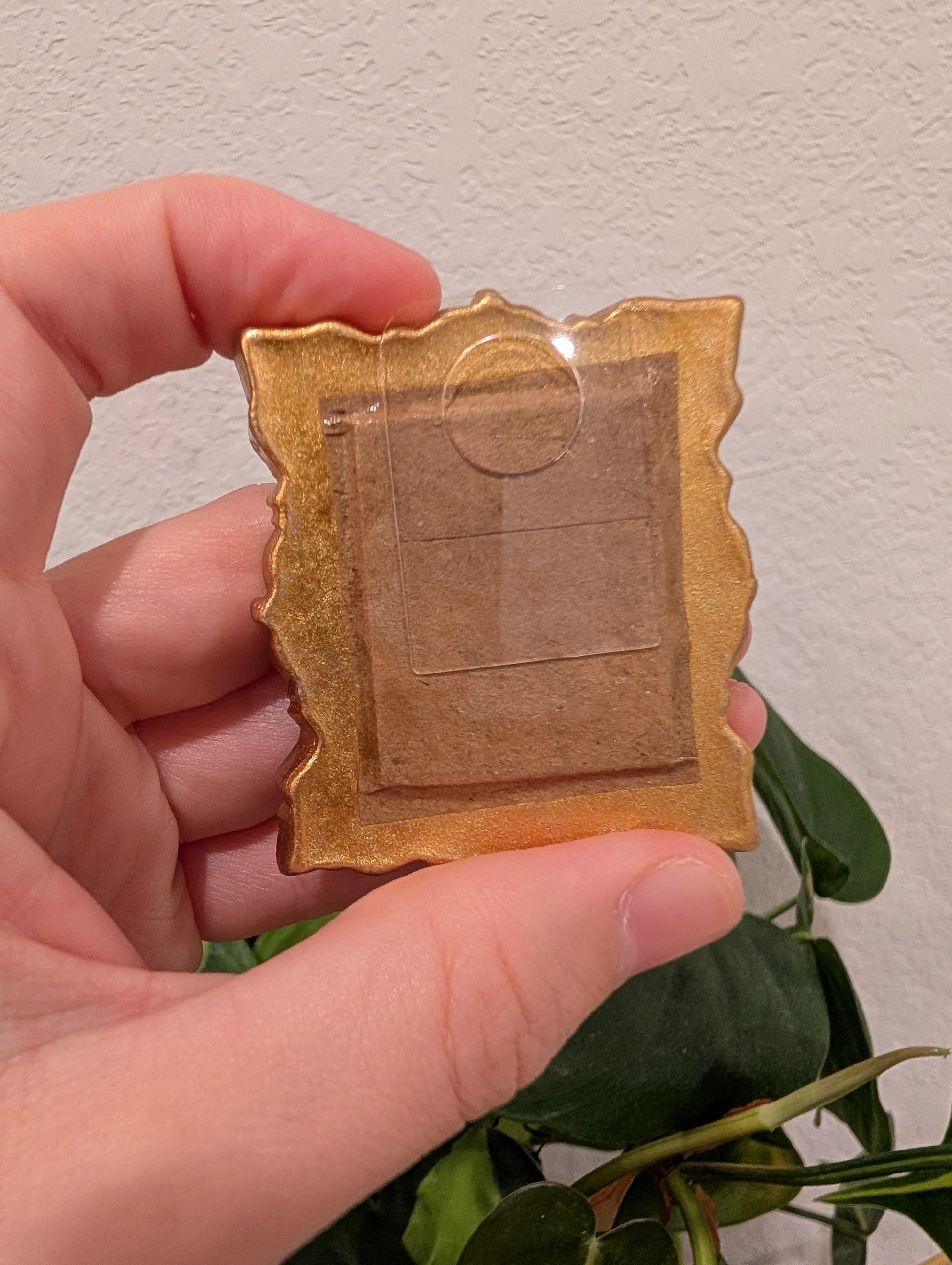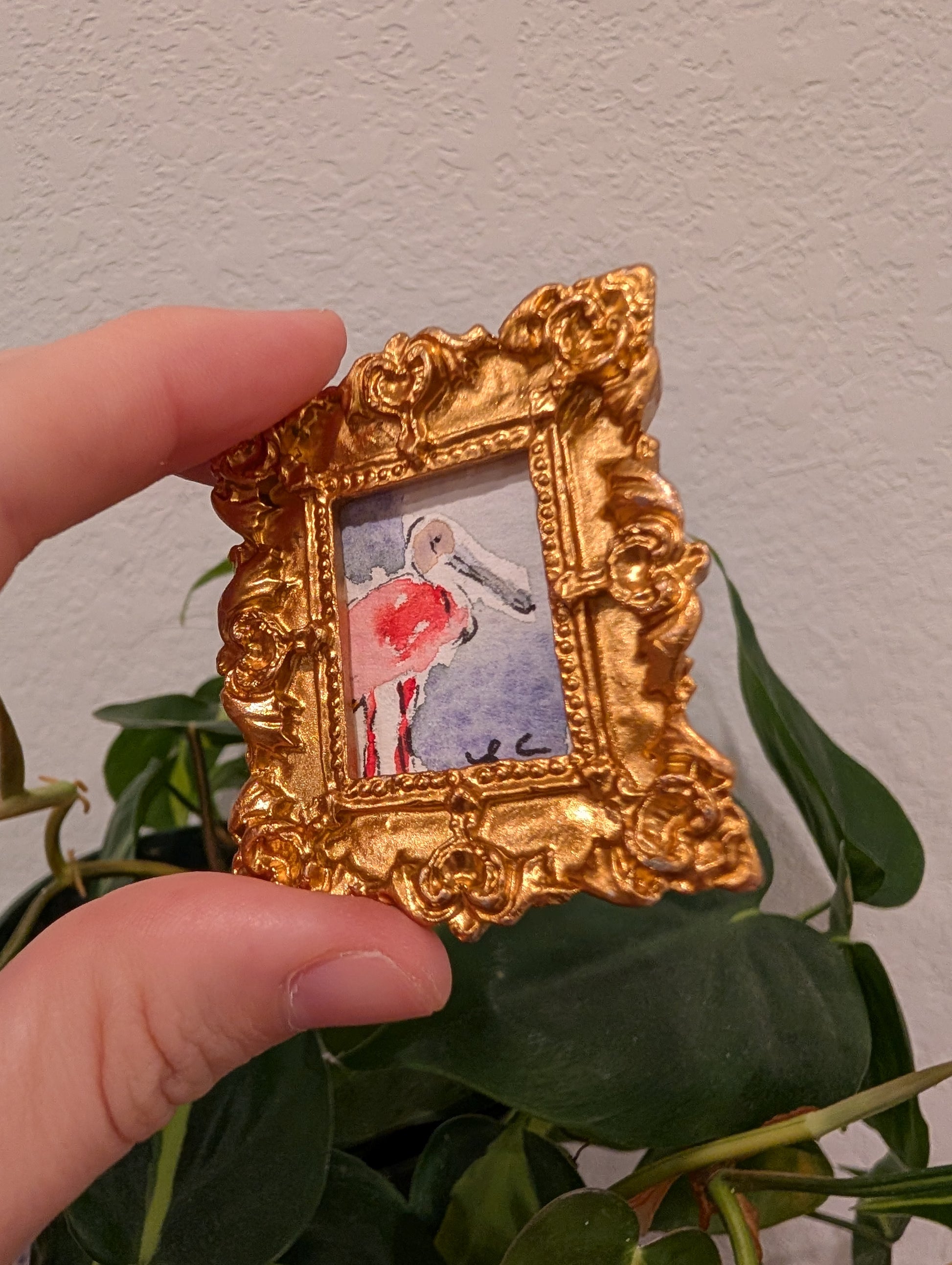 These make great gifts for any miniature enthusiast! It comes in the little gold frame, and has a tag hanger on the back.