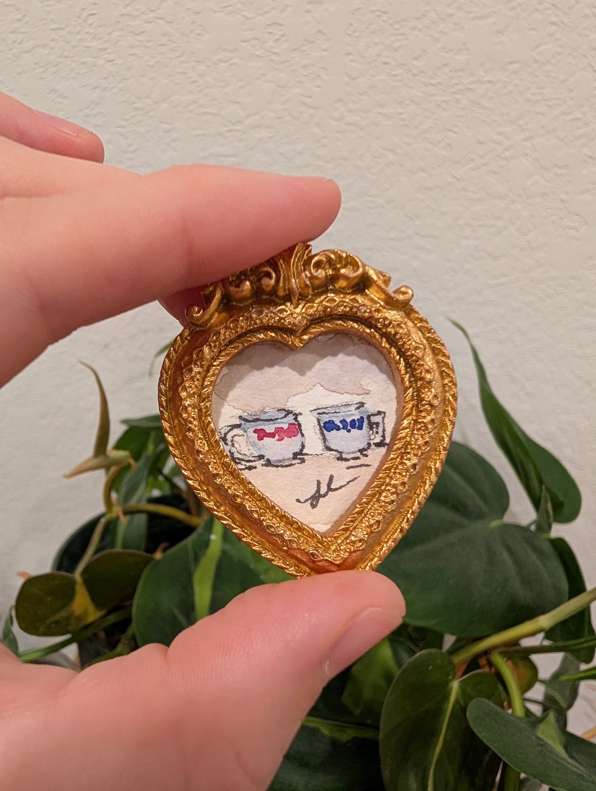 These make great gifts for any miniature enthusiast! It comes in the little gold frame, and has a tag hanger on the back.