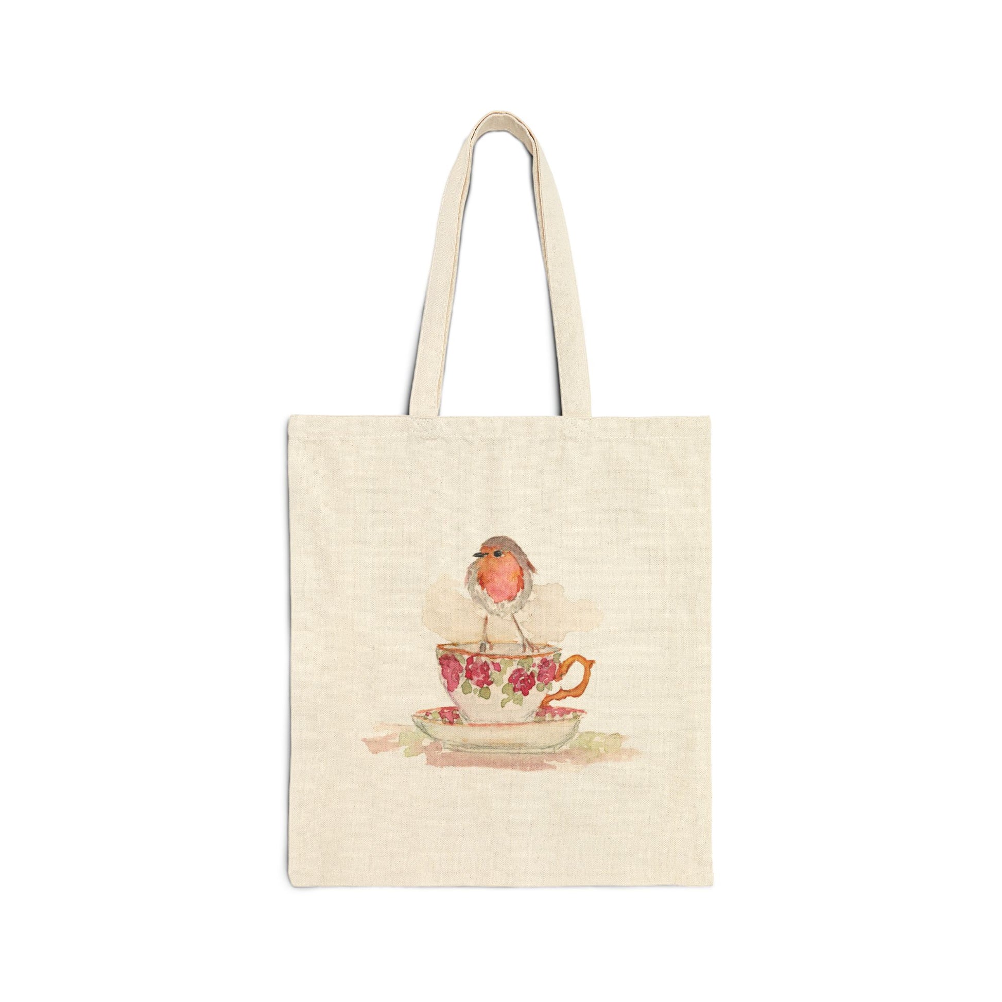 Robin on a Teacup - Watercolor Canvas Tote Bag - Lora Cavallin Art